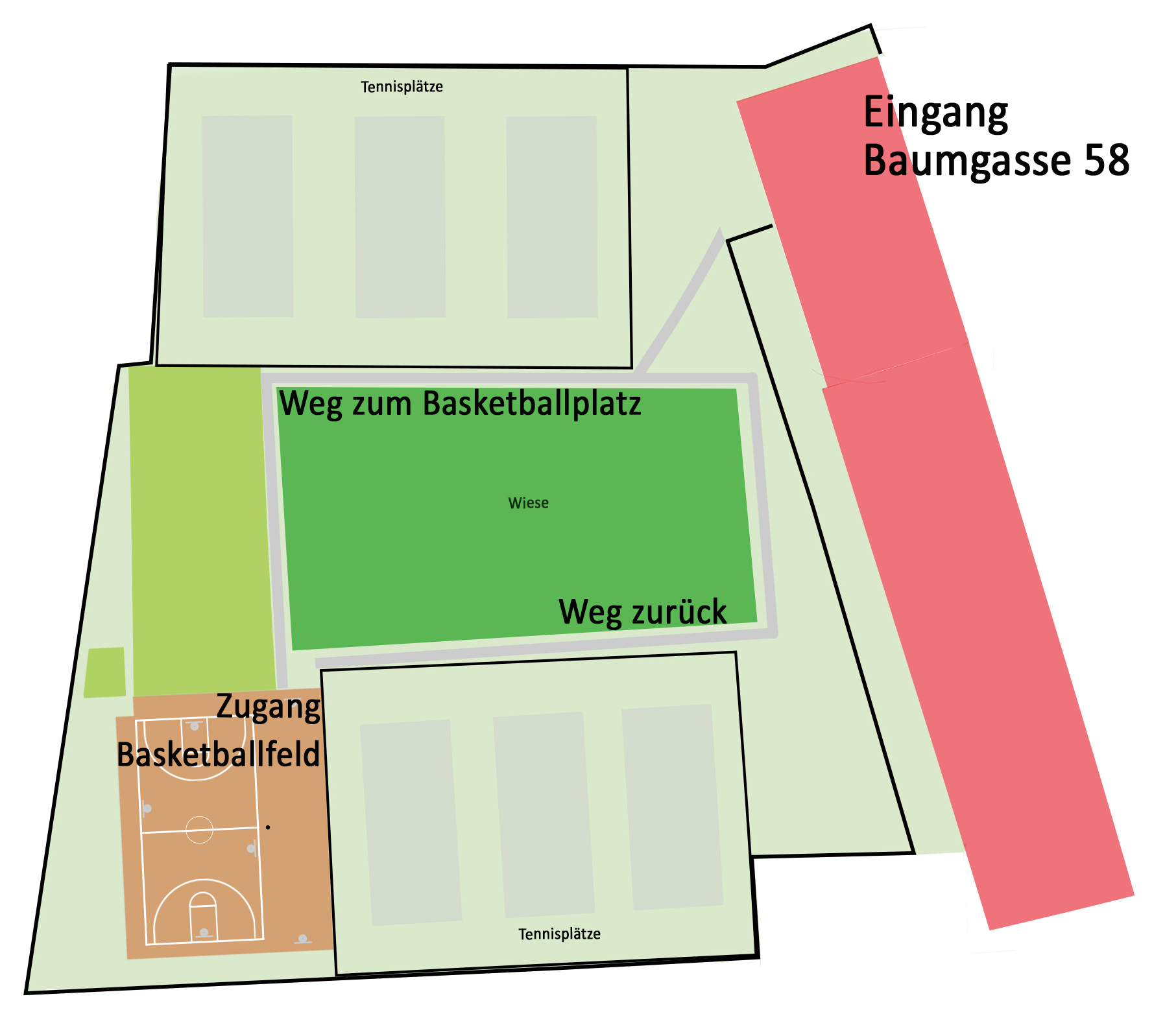 Der Zugang erfolgt über den Haupteingang der Sportanlage - 3. Baumgasse 58. Der Weg zum Basketballfeld führt über den Gehweg entlang der vorderen Tennisplätze, der Rückweg auf einem eigens markierten Weges entlang der hinteren Tennisplätze.